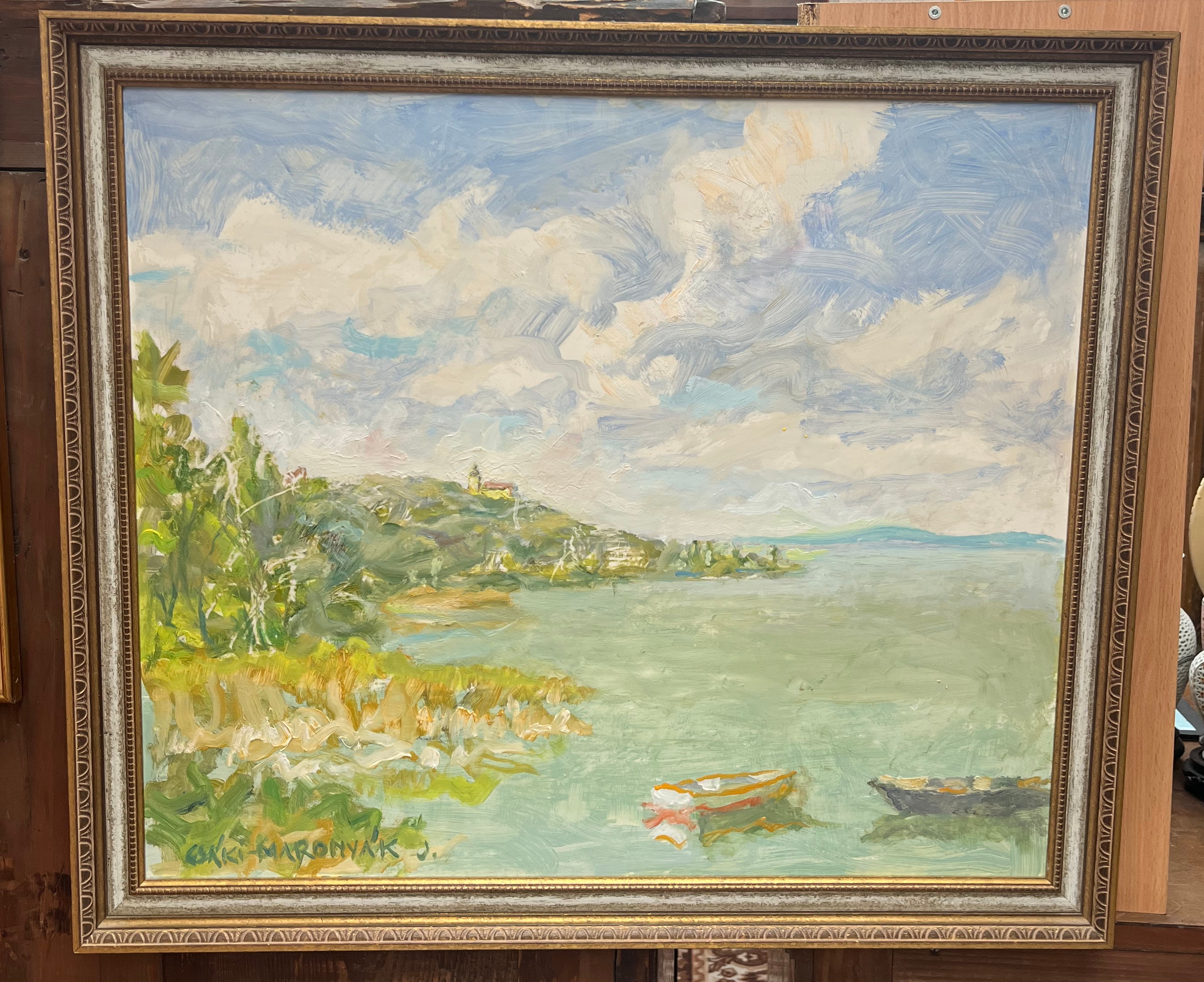 180 000.-ft * Csáki-Maronyák József 1910-2002 festőművész munkája, olaj-farost technika, Tihanyi látkép ( 79 x 69 ) kerettel együtt
