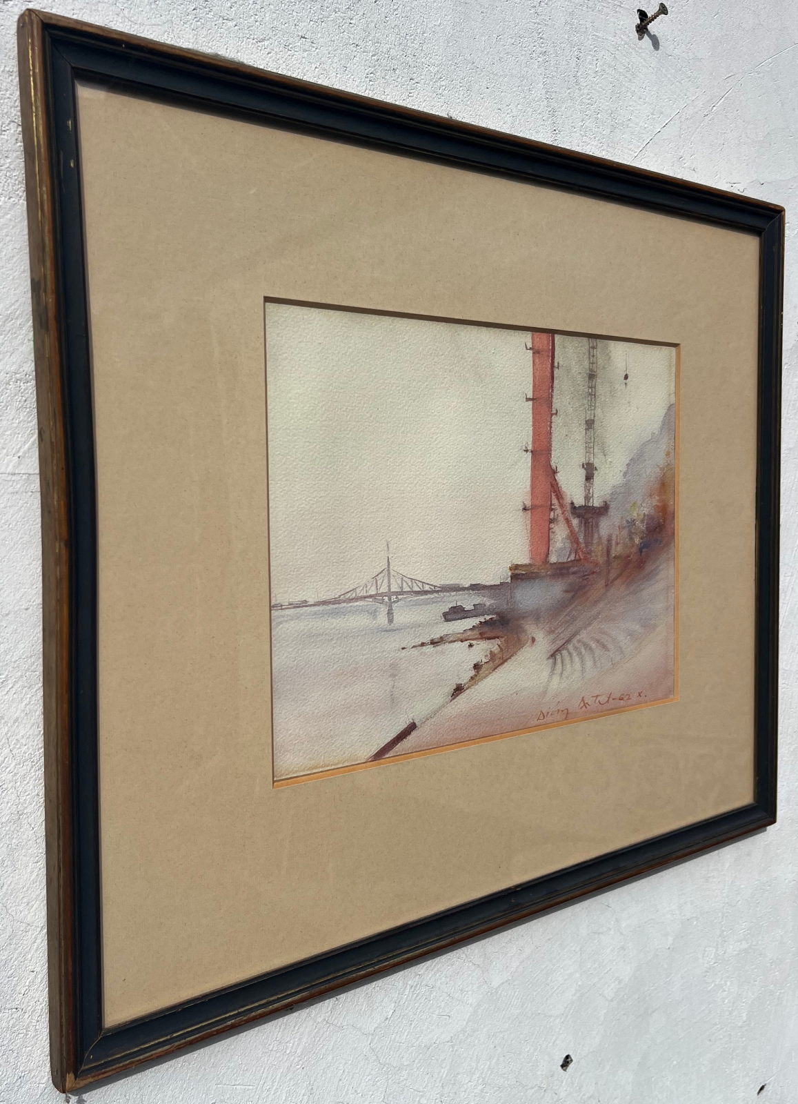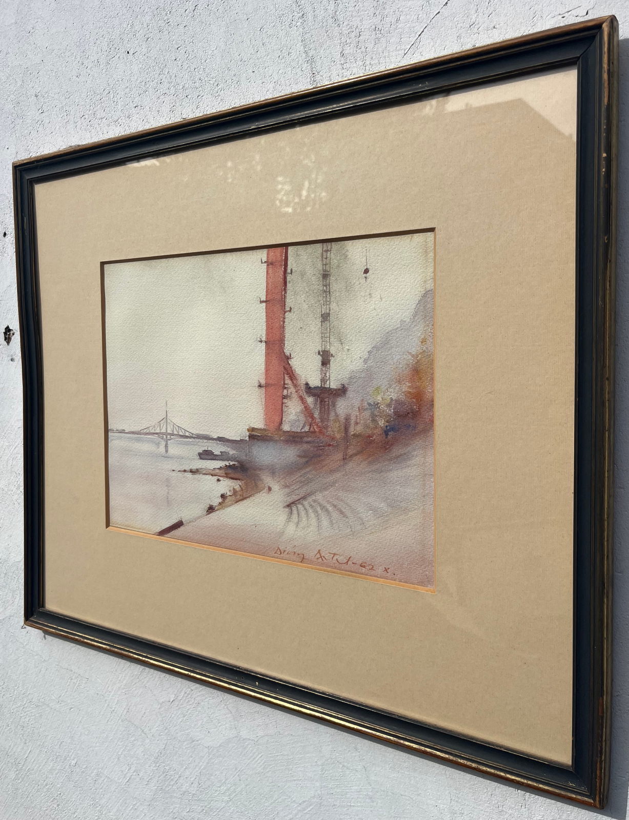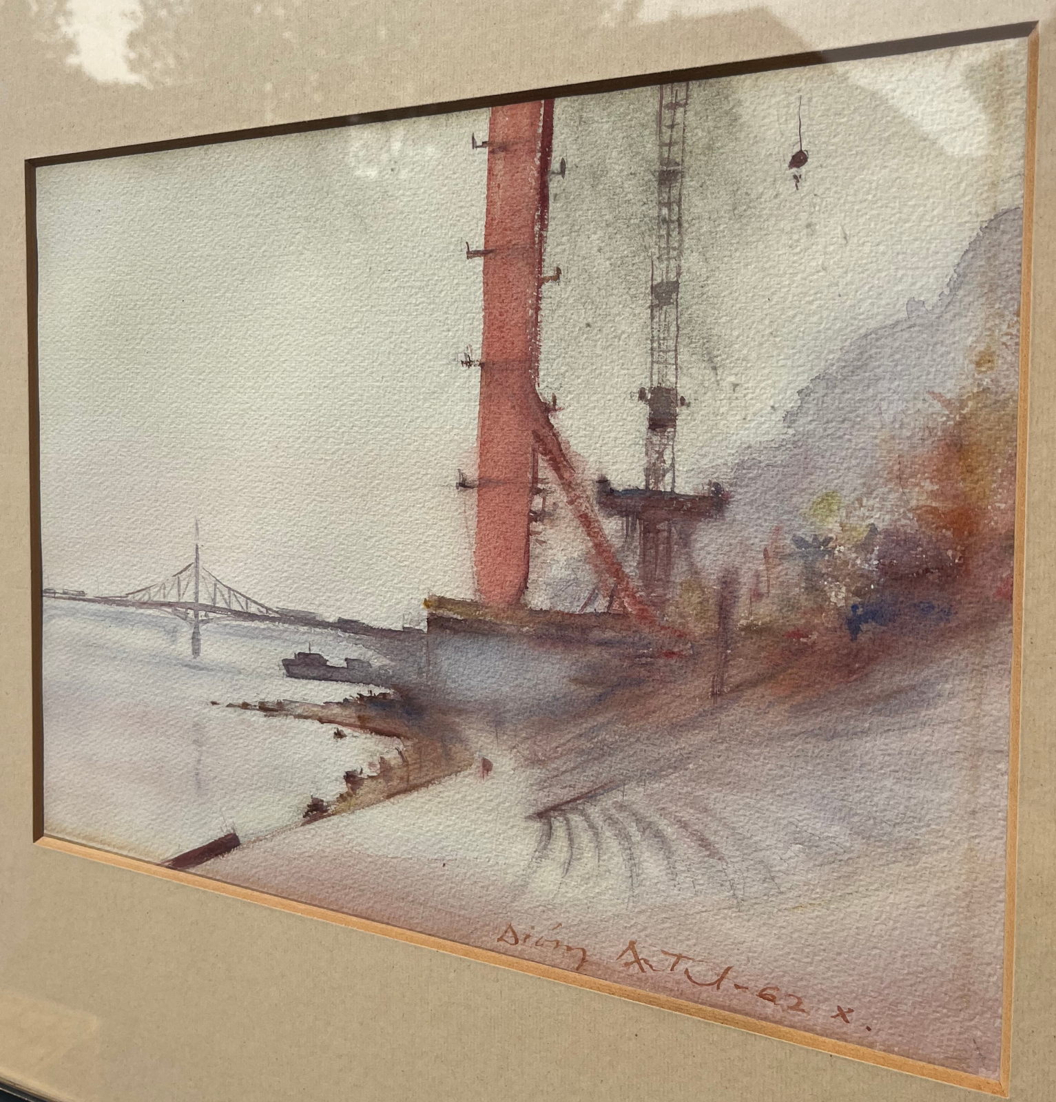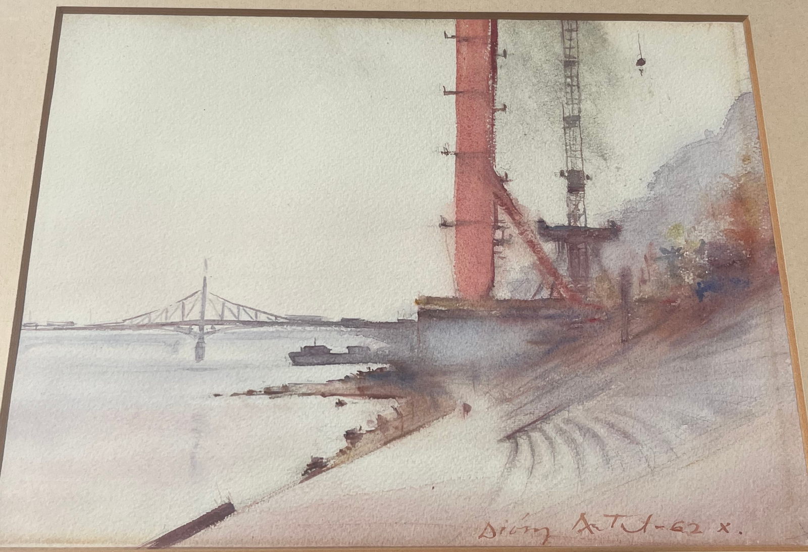 58 000.-ft * Diósy Antal (1895 - 1977) Erzsébet Híd Építés 1962 X. akvarell festménye kerettel (62 x 52) keret nélkül (36 x 27)