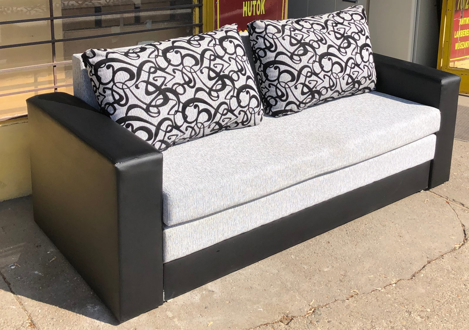49 900 ft * Szürke műbőrkarfás kanapé ( 200szél 90mély 45/80mag)