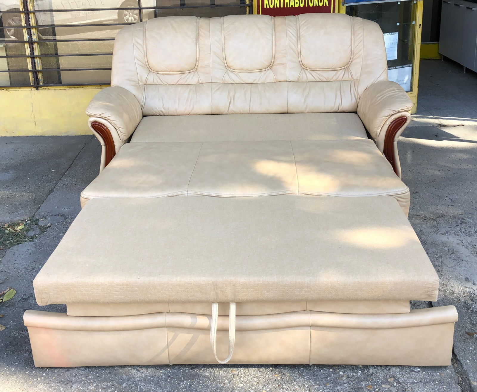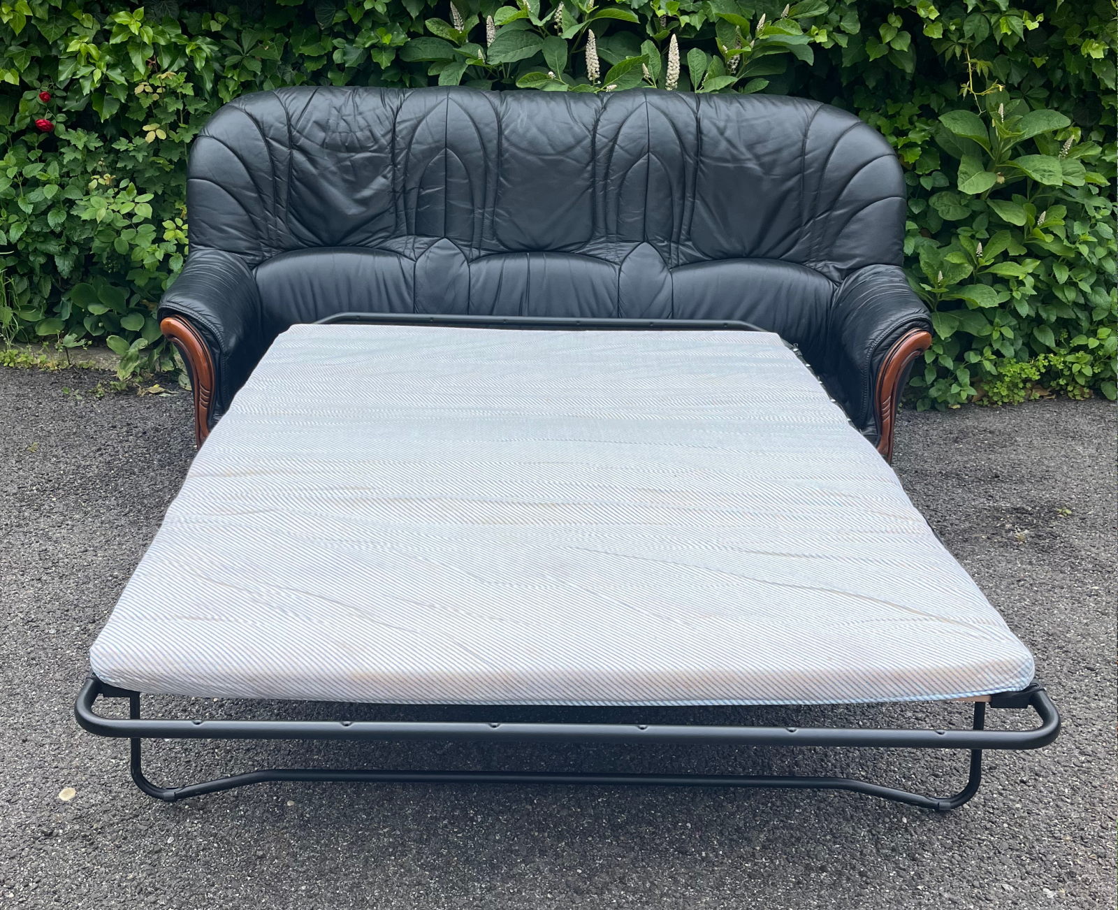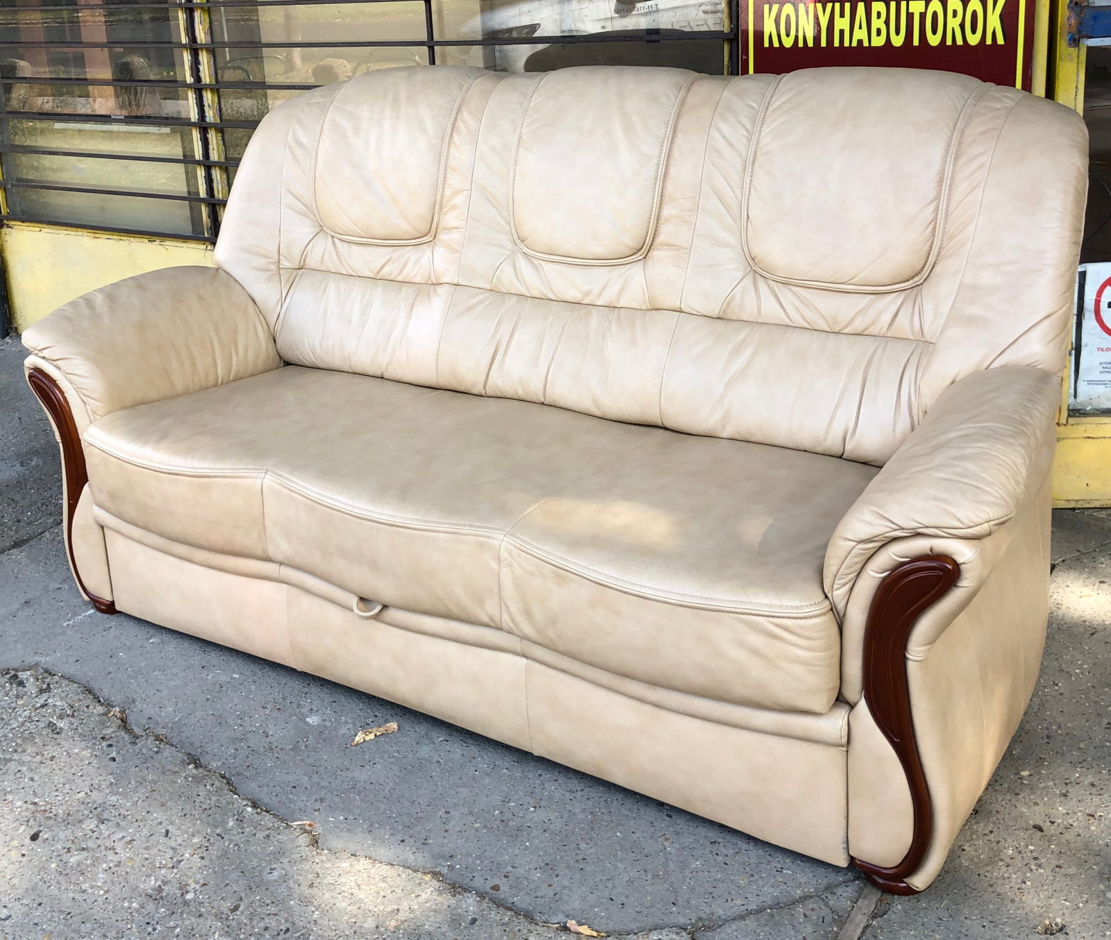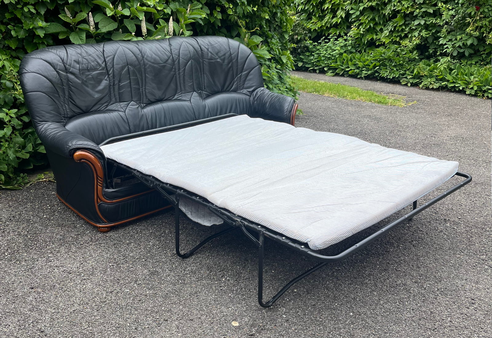 99 800.-ft * Fekete fa betétes ágyazható bőr kanapé (195 szé 90 mély 45/100 magas)